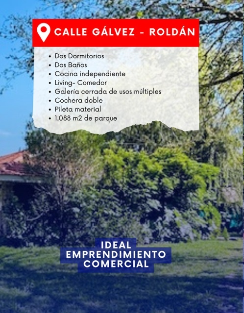 Oportunidad única sobre calle Gálvez, Roldan. Esta casa en venta se extiende sobre una superficie total de 1088 m2 de parque, Cuenta con Cocina Independiente. Living-comedor. Dos Dormitorios. Dos baños. Galería cerrada de usos múltiples. Cochera Doble. Pileta de Material